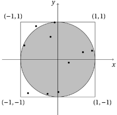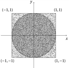 Klassinen esimerkki Monte Carlo -simulaatiosta olisi arvioida luvun π arvoa arpomalla satunnaislukuja x ja y väliltä [–1,1] ja katsoa, kuinka suuri osa pisteistä (x,y) osuu origokeskisen yksikköympyrän sisään. Jos x2+y2 ≤ 1, piste osuu ympyrän kehälle tai sisälle, ja jos x2+y2 > 1, piste on ympyrän ulkopuolella.