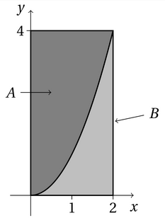 Tasojoukon A pisteet (x,y) määräytyvät epäyhtälöistä 0 ≤ x ≤ 2, 0 ≤ y ≤ 4 ja yx2. Tässä tehtävässä on tarkoitus arvioida joukon A pinta-alaa simulaation avulla käyttämällä sitä tietoa, että todennäköisyys on suoraan verrannollinen pinta-alaan. Arvotaan pisteitä (x,y) suorakulmiosta B, jonka määräävät epäyhtälöt 0 ≤ x ≤ 2 ja 0 ≤ y ≤ 4.